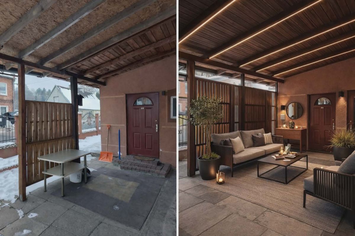 Wejście do mieszkania jest zadaszone i ogrodzone, co tworzy przestrzeń idealną do wypoczynku oraz spotkań towarzyskich ale równeiż daje wiele możliwości do własnego zagospodarowania.